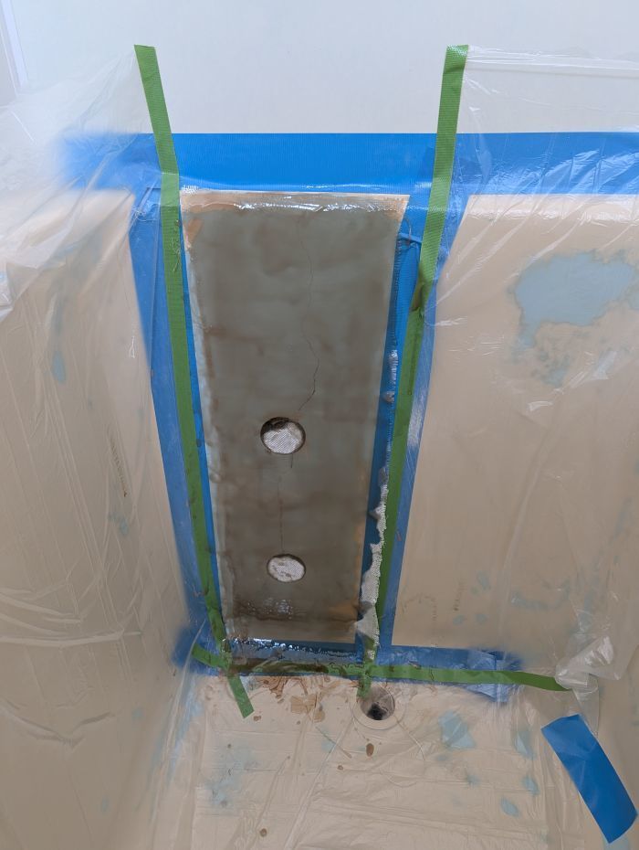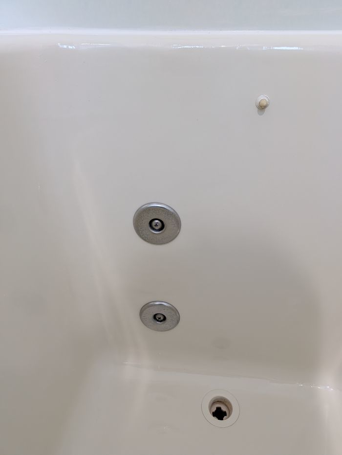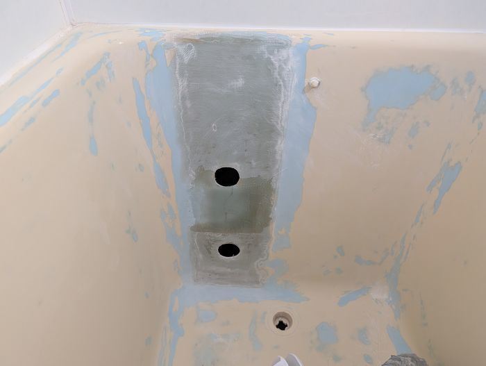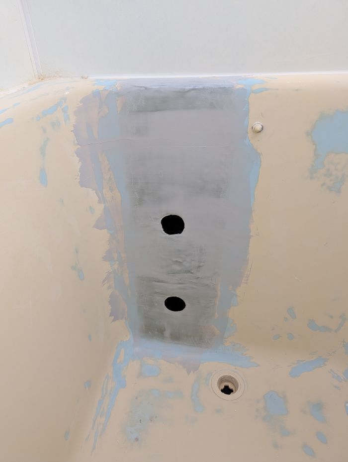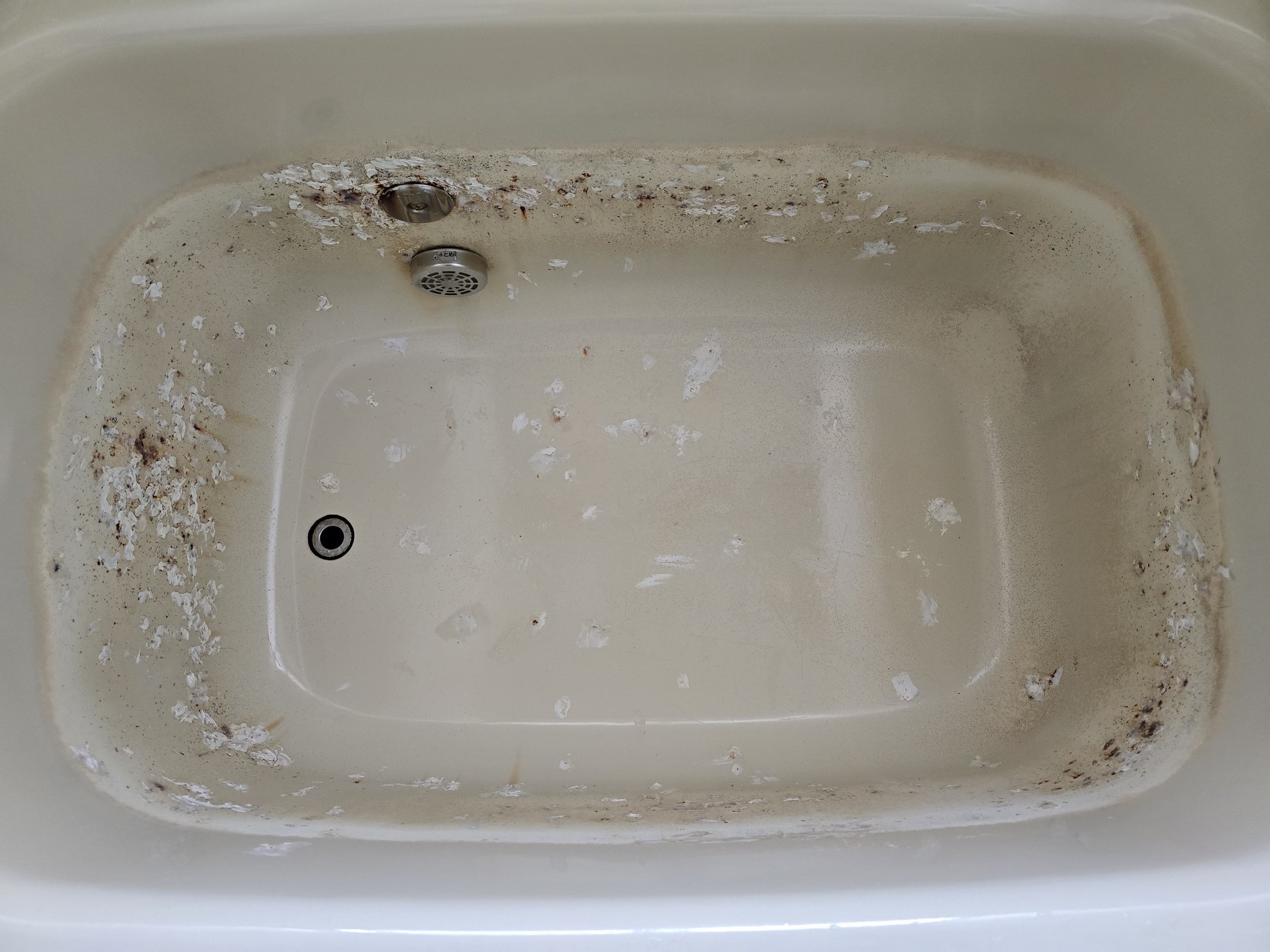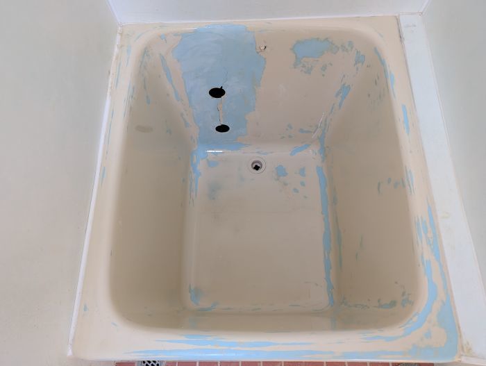 一体式の浴槽です。喫水線より下が変色。洗っても、クリアーコートしても収まらず浴槽交換も不可能なので塗装でリニューアルします。