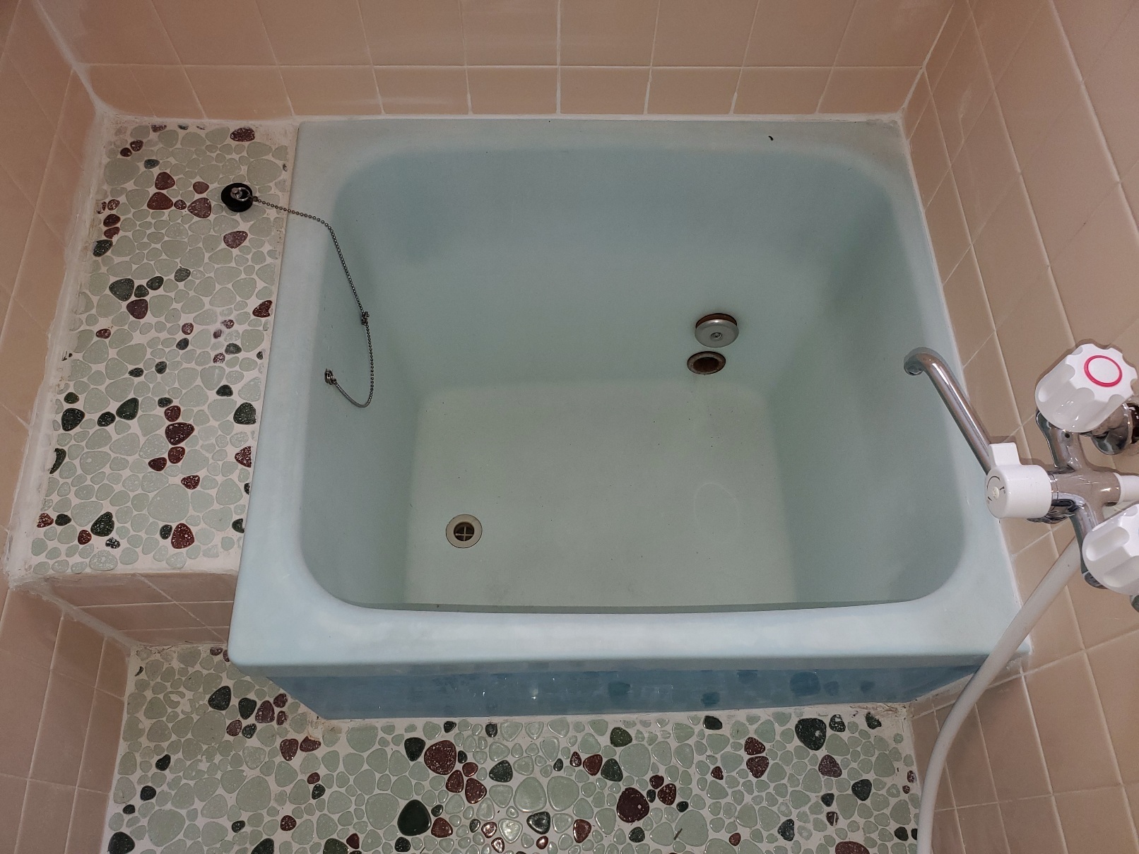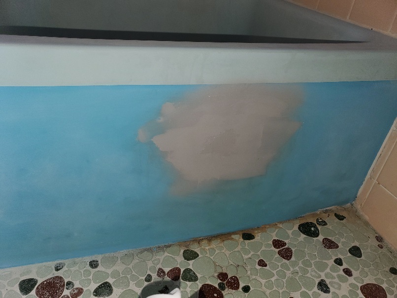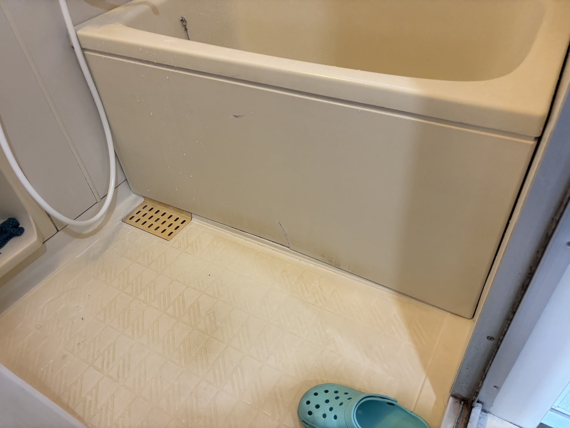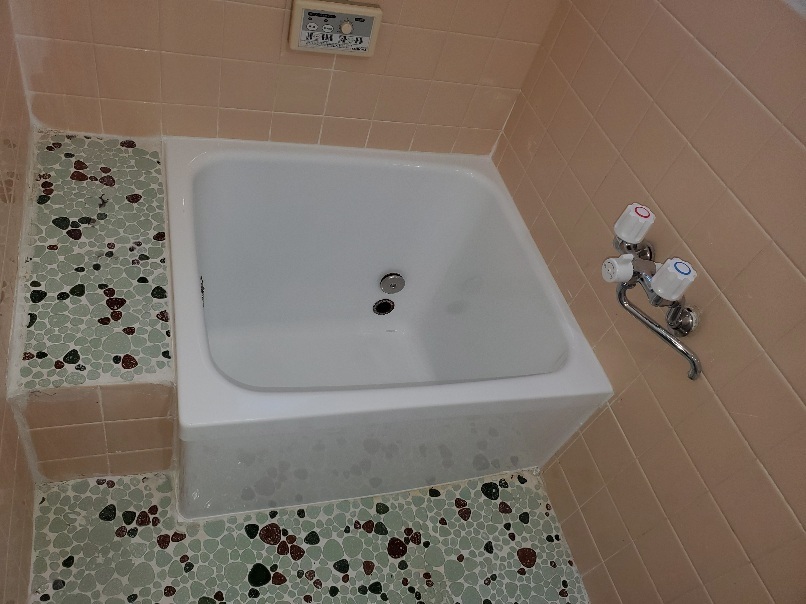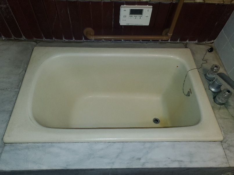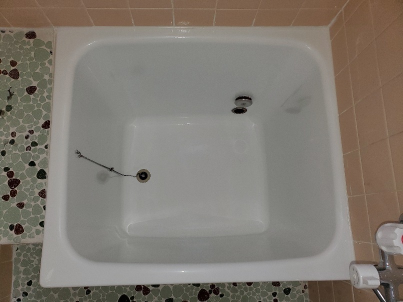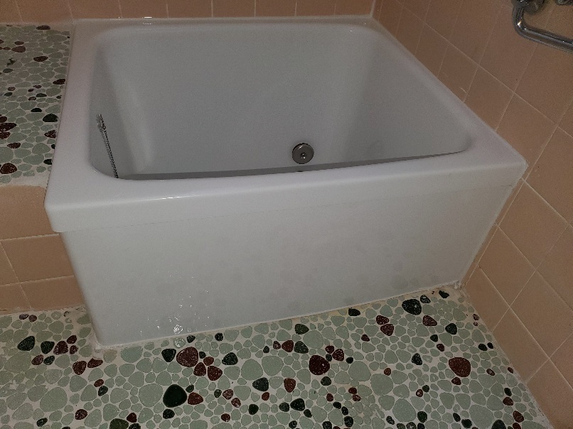 昔ならではの小型ポリ浴槽です。このタイプで多いのが全体ひび割れか、繊維ばく露状態のチクチク浴槽が見られます。この浴槽年数経過の割にはそれはなかったです。(よかった~)
