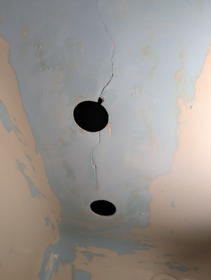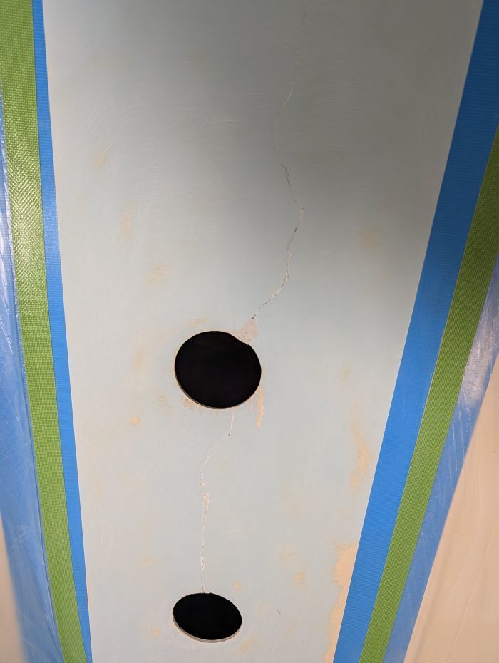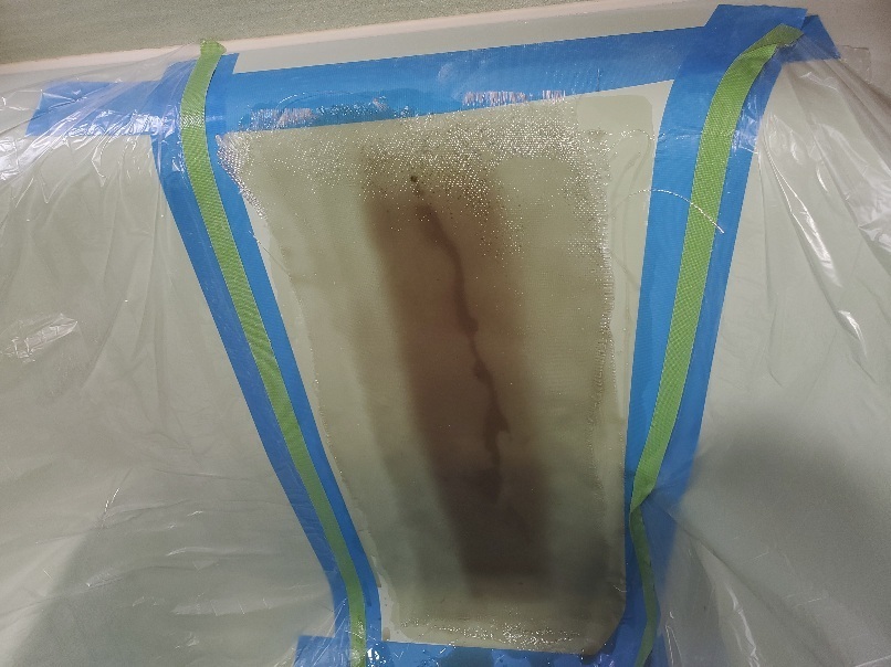 筋のように見えますが、ヒビ部分ファィバーパテ、FRPライニングで、ガラスマット2枚、グラスクロス3枚入れてます。