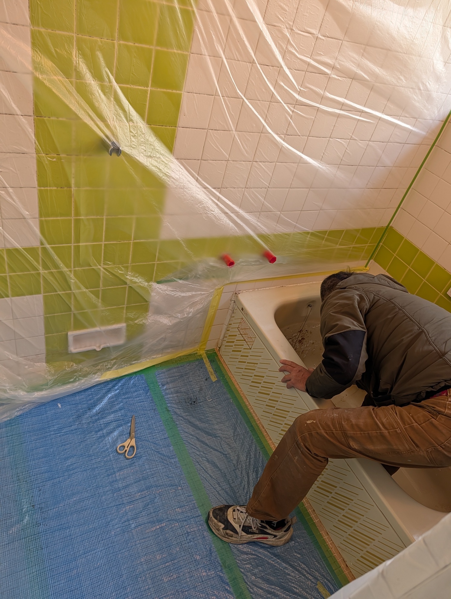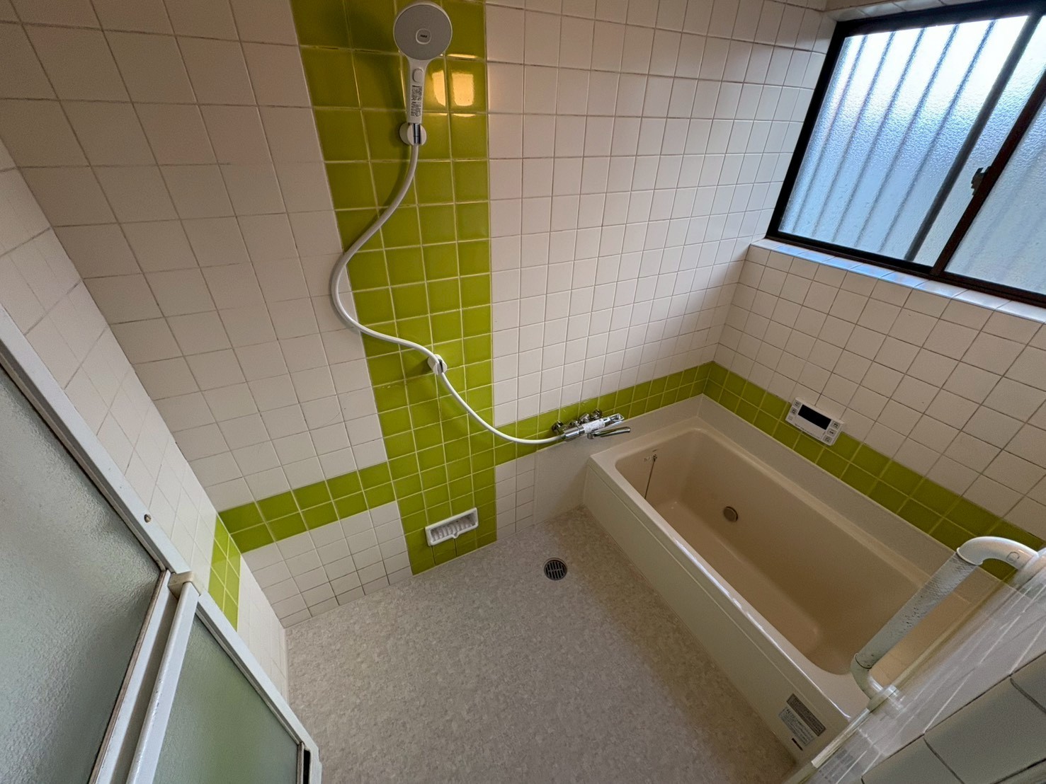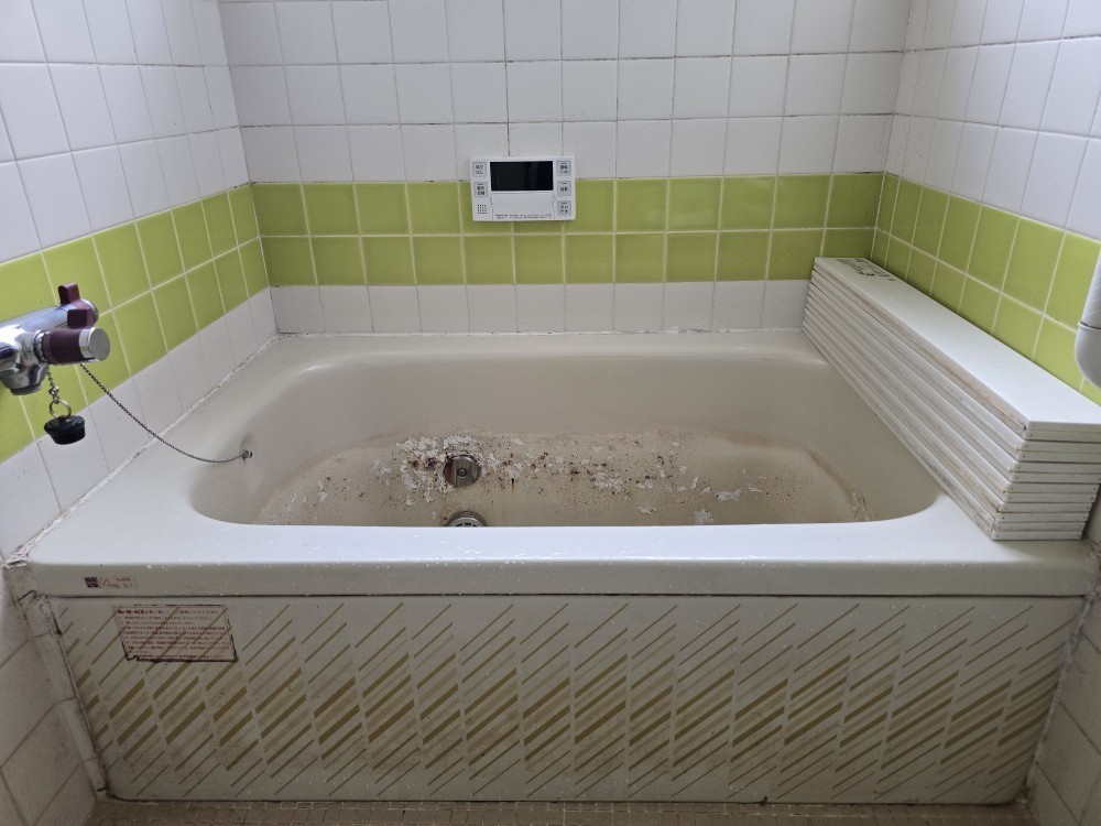 壁タイル、浴槽埋め込み式、タイル床。このタイプを在来式と呼びます。塗装とシートでリニューアルします。