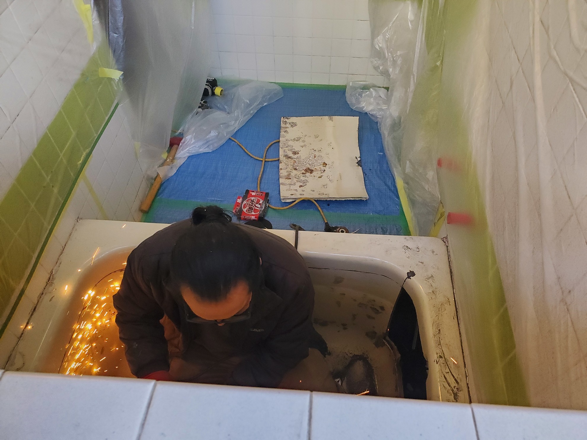 ホーロー浴槽は、重たすぎるので中で切断します。