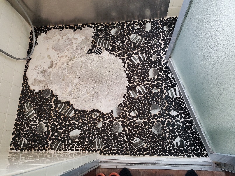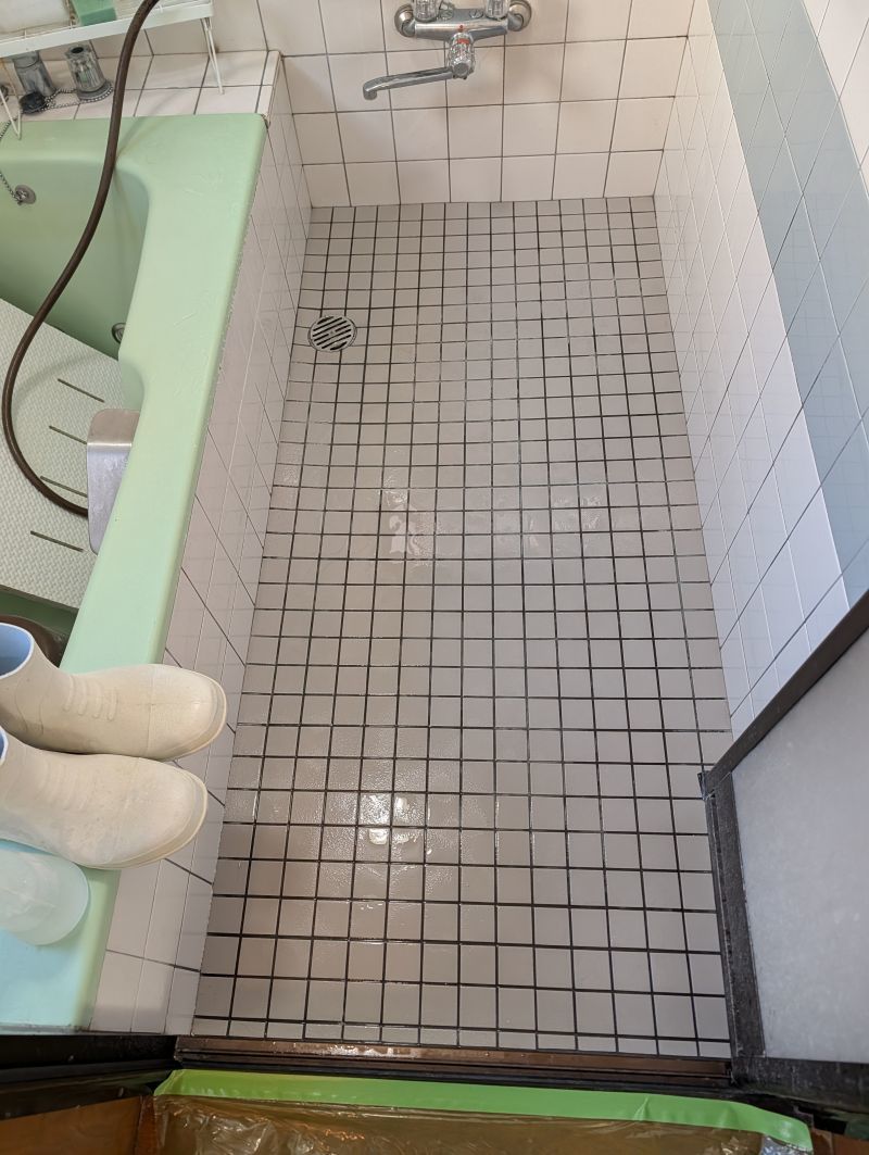 加東市からほど近い西脇市での、在来浴室洗い場床シート施工です。タイルのない部分は不陸調整します。