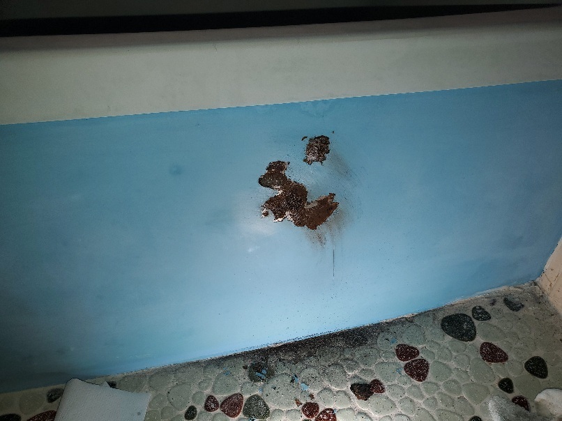 ユニットバス壁塩ビ鋼板製、鉄の部分が濡れて錆が出ます。