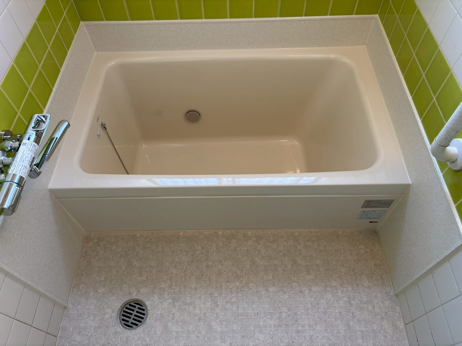クリーミーカラーで再生、床はバスナシート。浴槽は新浴槽設置、浴槽はサイズが合えば置き型において交換可能です。